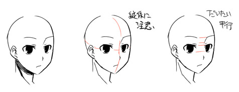 よくある向きだけれど、顔というのは起伏があるものであることをまず意識する。当然縦線は直線にはならない。まぁ、これはその縦線が意味するところがなんなのかというところだけれど。横線に関しては眉毛、目の上部、下部と3本くらい平行に線をひくとバランスがうまくとれるのではないかとおもう。最低でも目の上下は気をつけて欲しい。これが狂うだけで結構変に見えてしまうものである。