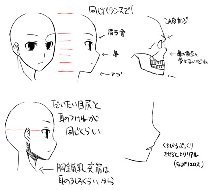 まずは正面とバランスを合わせること。これはある程度慣れが必要な気がするけれど。また輪郭で意識したいのは書いてあるとおり、眉弓骨(と眼窩)、鼻、アゴである。簡単に頭蓋骨も描いて見たのでそれと照らし合わせてもらえればわかりやすいと思う。アニメ絵だろうがなんだろうが、骨は同じであり、構造は同じであるので、意識したい。