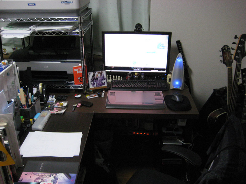 時々ペンタブをディスプレイの左に立てかけて、PCの前でアナログ作業をする場合もあるけれど大抵はこのようにデスクをL字にして左をアナログ、右をデジタルというように分けて作業をしてます。